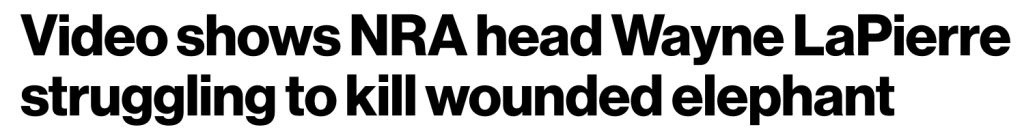 The wonderful elephant, a massive, beautiful, intelligent, compassionate, sensitive and ultimately helpless creature, died slowly at this scumbag’s cruel, merciless and pathetic hands. For shame, Wayne LaPierre! You sick piece of repulsive shit.